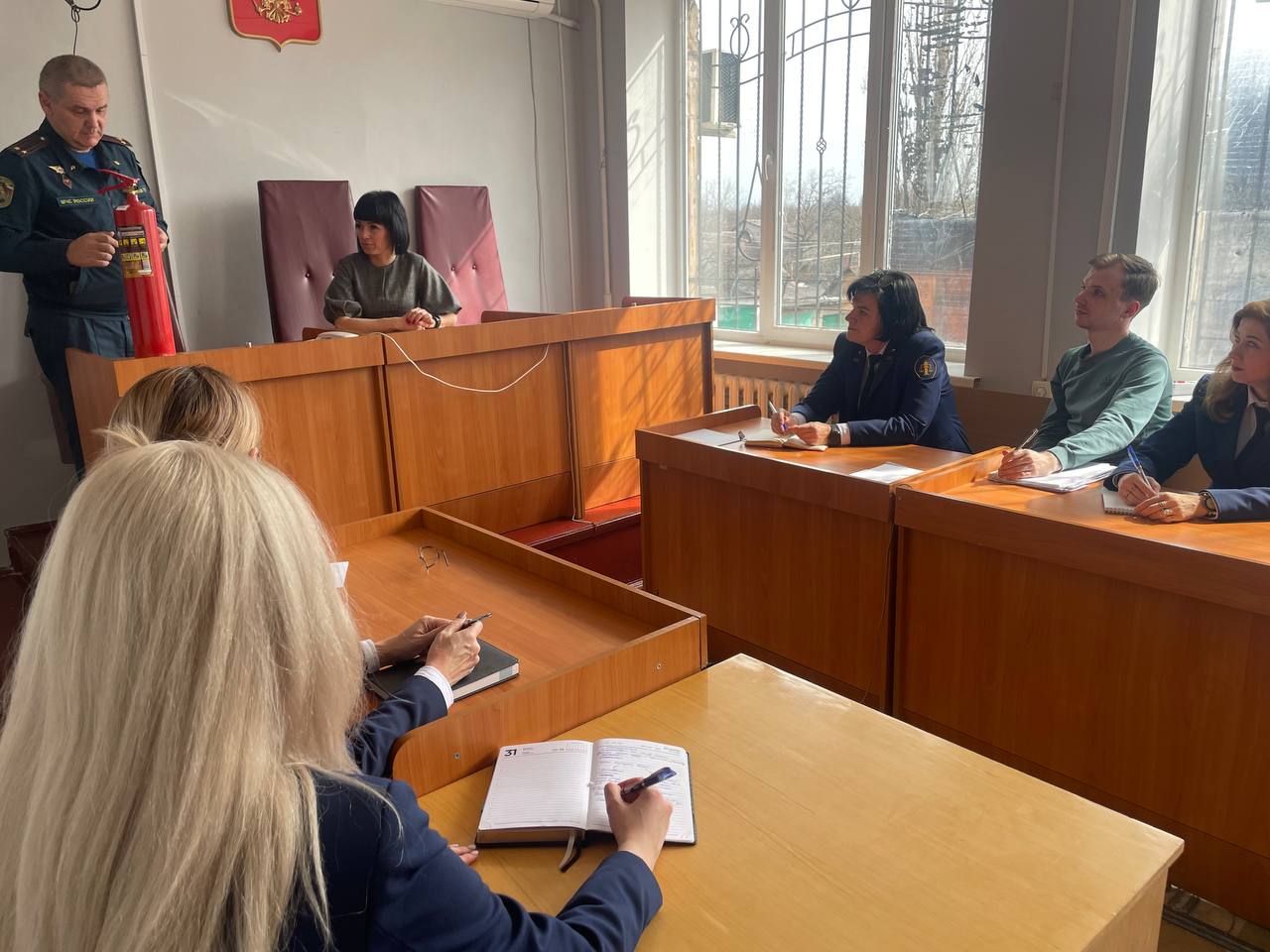 | Председателем Ясиноватского городского суда Е.В. Скичко организовано занятие с судьями, сотрудниками аппарата суда при участии начальника отдела надзорной деятельности и профилактической работы Ясиноватского МО управления надзорной деятельности и профилактической работы Главного управления МЧС России по Донецкой Народной Республике Е.А. Толстых. В рамках данного мероприятия судей и сотрудников аппарата ознакомили с требованиями пожарной безопасности на рабочем месте, а также с действиями ответственных лиц при возникновении пожара на рабочем месте. Кроме этого, был проведен инструктаж по вопросу техники безопасности при использовании средств первичного пожаротушения, указаны особенности организации эвакуации из здания при пожаре. ![]() |